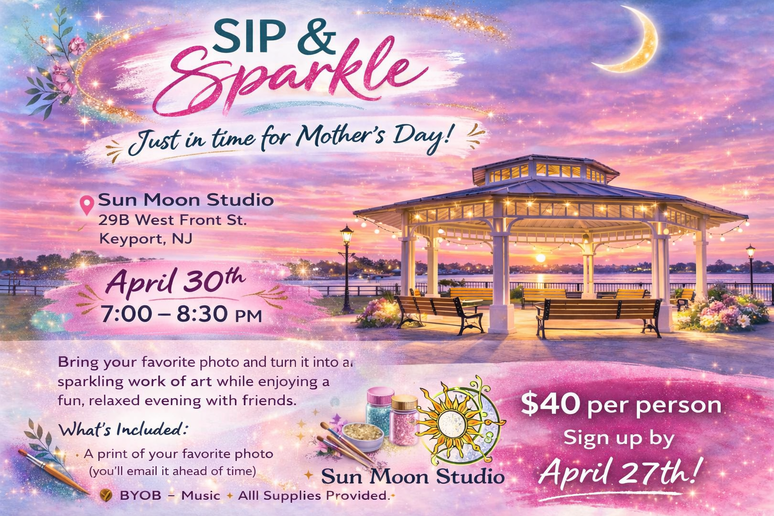 Join us for Sip & Sparkle: A Glittery Girls’ Night Out at Sun Moon Studio! During this fun and creative evening, you’ll design a beautiful glitter artwork using your favorite photo as inspiration. You’ll receive a glitter kit and a printed copy of your photo (just email it ahead of time).  Bring your favorite drink, relax with music and laughter, and enjoy a sparkly night of creativity with friends!