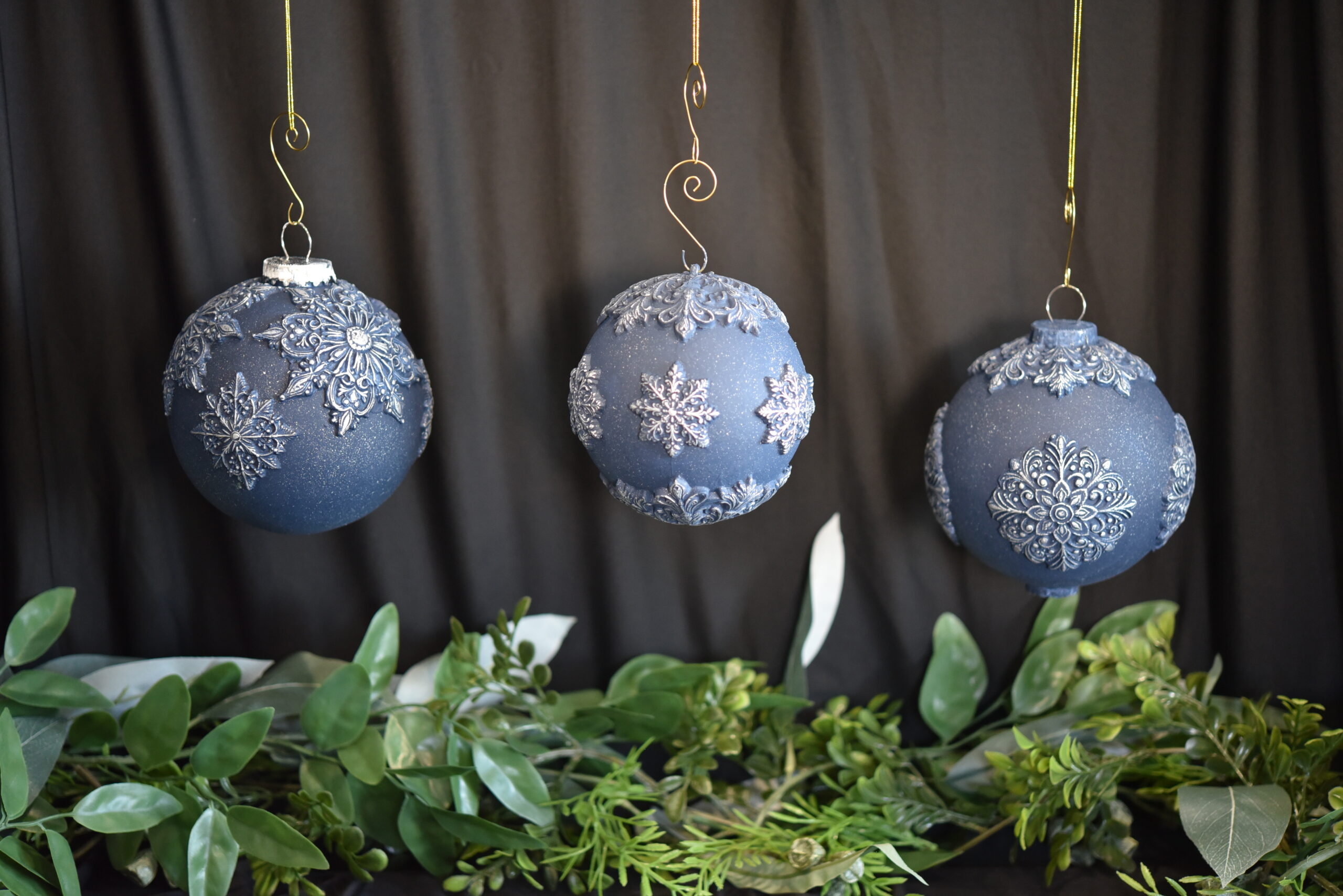 Create 3 winter-inspired ornaments featuring detailed snowflake molds applied to a round form for added texture and dimension. Finished in deep night-sky tones with icy winter accents, each piece highlights the intricate structure of the snowflakes while maintaining a classic seasonal feel. The result is a refined ornament that feels crisp, quiet, and timeless.